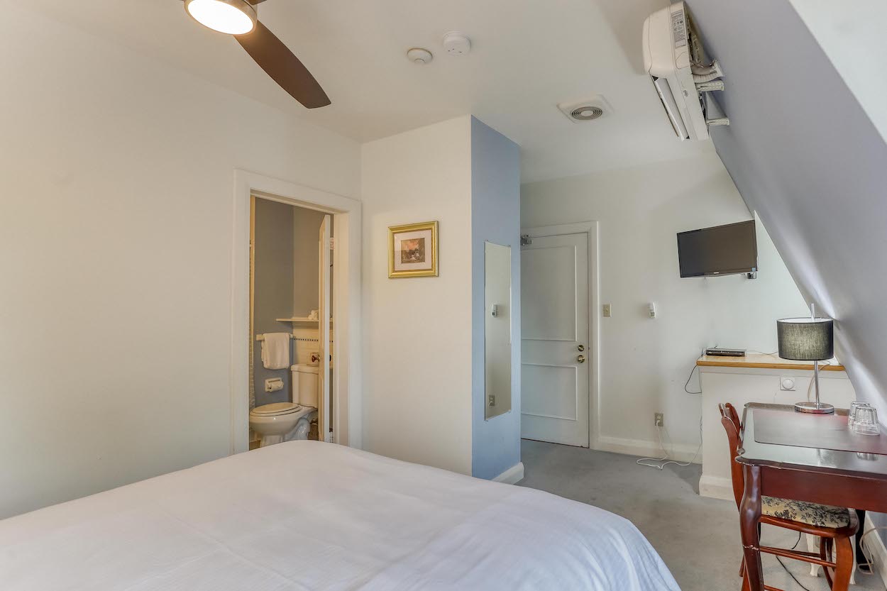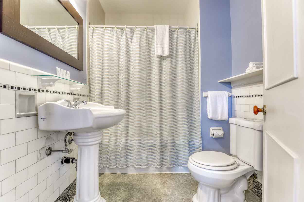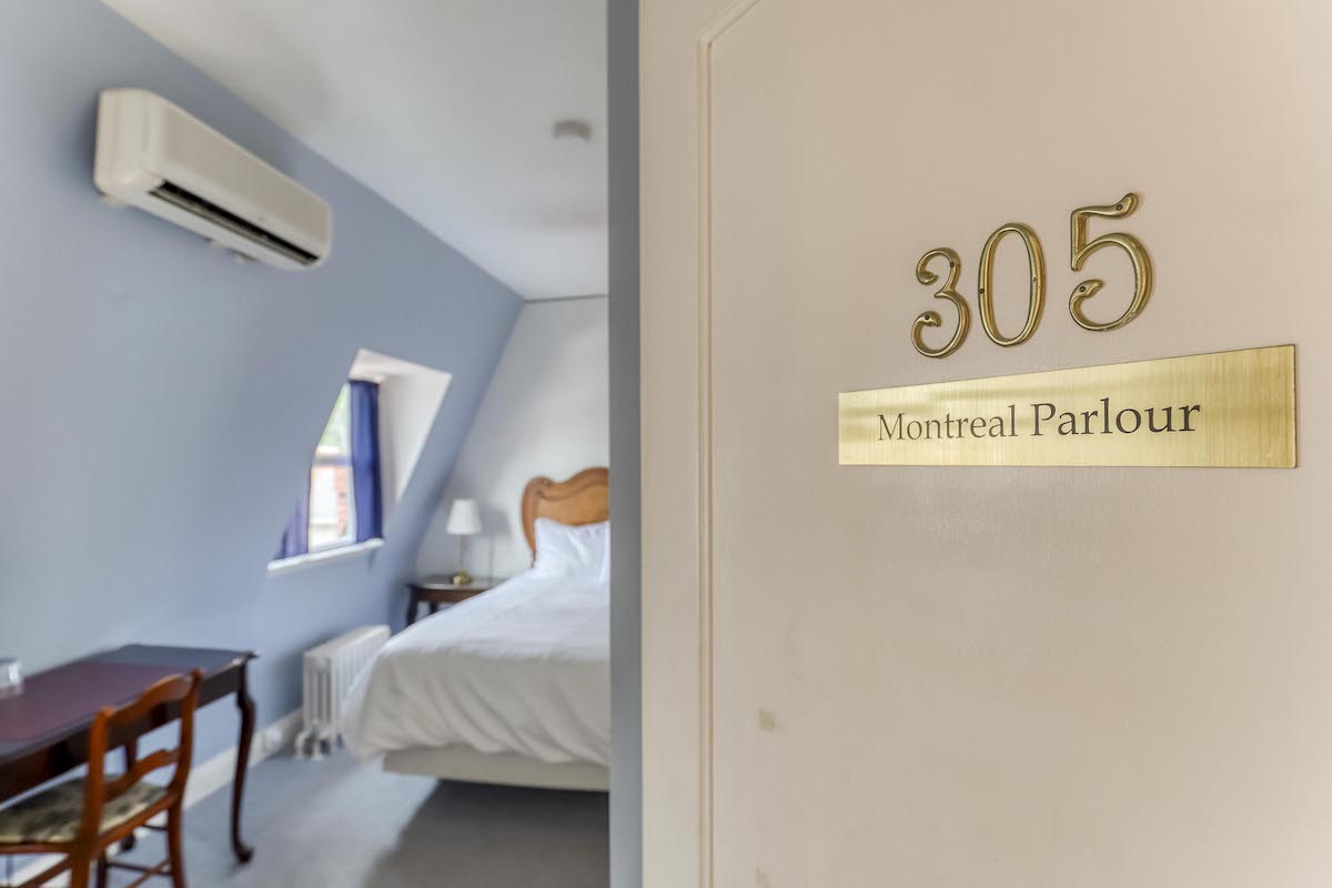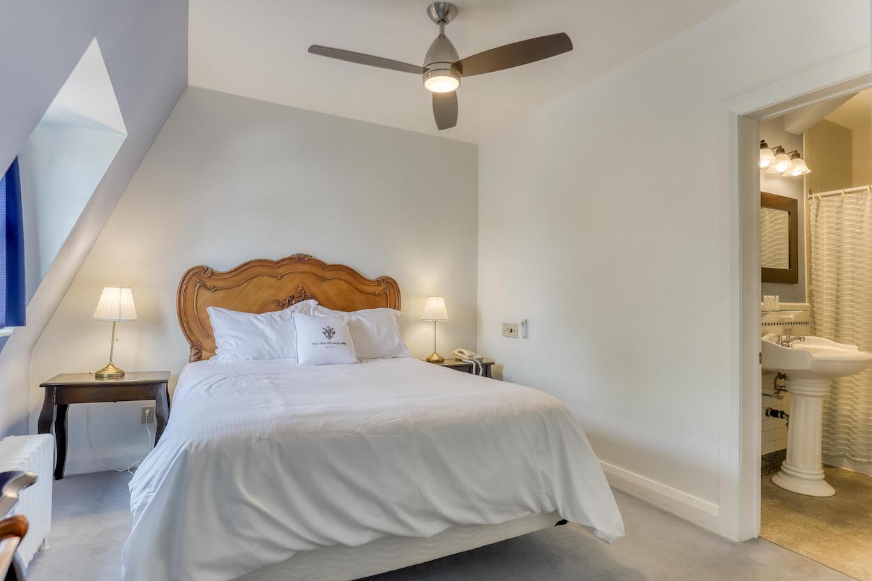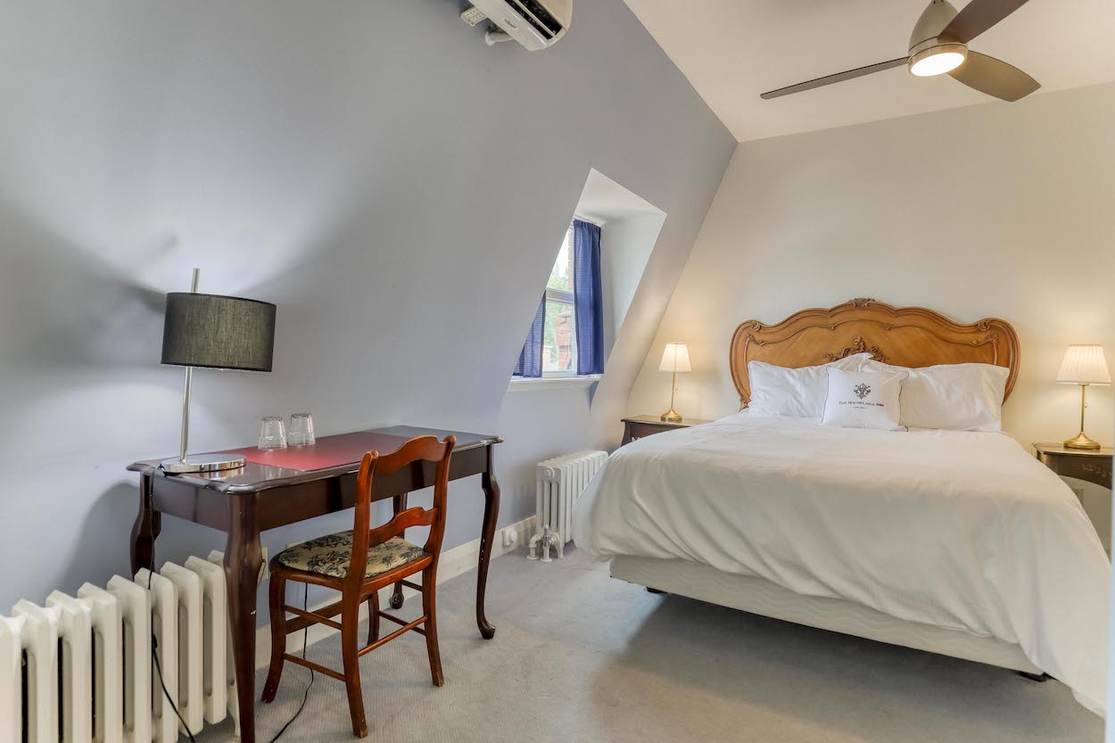 This 135 square foot light-filled room received its name from the original building’s second owner, the Bank of Montreal in 1907. The bank owned this building for twenty-six years and was responsible for some of the unique features of the Inn, such as the coat of arms found on the front entrance doors and the gorgeous double-sided fireplace in the main seating area. The bank also gave this mansion the name we still use today, the Hochelaga Inn. This Executive room sleeps two people, it is furnished with a queen-size bed and a beautiful antique headboard, a working desk, as well as a three-piece washroom. Decorated with airy blue tones, this room is the perfect little escape.